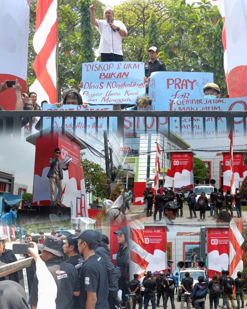 Surabaya – Media Indonesia Times | Aksi demo dan pernyataan sikap dari sejumlah Elemen Collaboration yaitu Gempar Jatim, MAKI Jatim, AMI, Gerak Jatim, dan APMI, termasuk pengacara, pengusaha, dan petani, mendesak Dinas Koperasi dan UKM Jawa Timur untuk menjelaskan dugaan kecurangan dalam proses pengadaan barang dan jasa yang mereka selenggarakan, pada Kamis (14/8/2025).