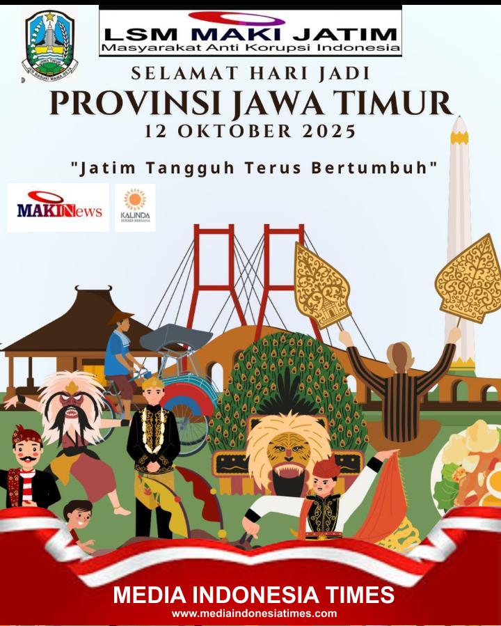 Surabaya – Media Indonesia Times | Dalam rangka memperingati Hari Jadi Provinsi Jawa Timur ke-80 yang jatuh pada tanggal 12 Oktober 2025, Masyarakat Anti Korupsi Indonesia (MAKI) Korwil Jawa Timur menyampaikan ucapan selamat dan apresiasi atas kemajuan pesat yang terus ditunjukkan oleh Jawa Timur di berbagai bidang pembangunan.