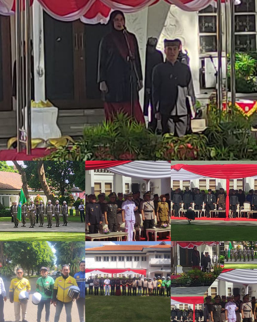 Usai memimpin upacara peringatan di halaman Kantor Pemkab, Bupati Banyuwangi Ipuk Fiestiandani menyerahkan secara simbolis helm dan rompi keselamatan kepada puluhan pengemudi ojek sebagai bagian dari program sosial “Banyuwangi Berbagi.”