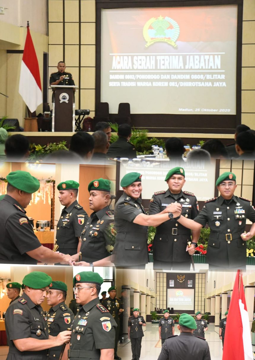 Madiun – Media Indonesia Times | Dua jabatan strategis di jajaran Korem 081/DSJ diserahterimakan. Dandim 0802/Ponorogo dari Letkol Inf Dwi Soerjono kepada Letkol Inf Farauk Saputra dan Dandim 0808/Blitar dari Letkol Inf Hendra Sukmana kepada Letkol Inf Virlani Arudyawan.