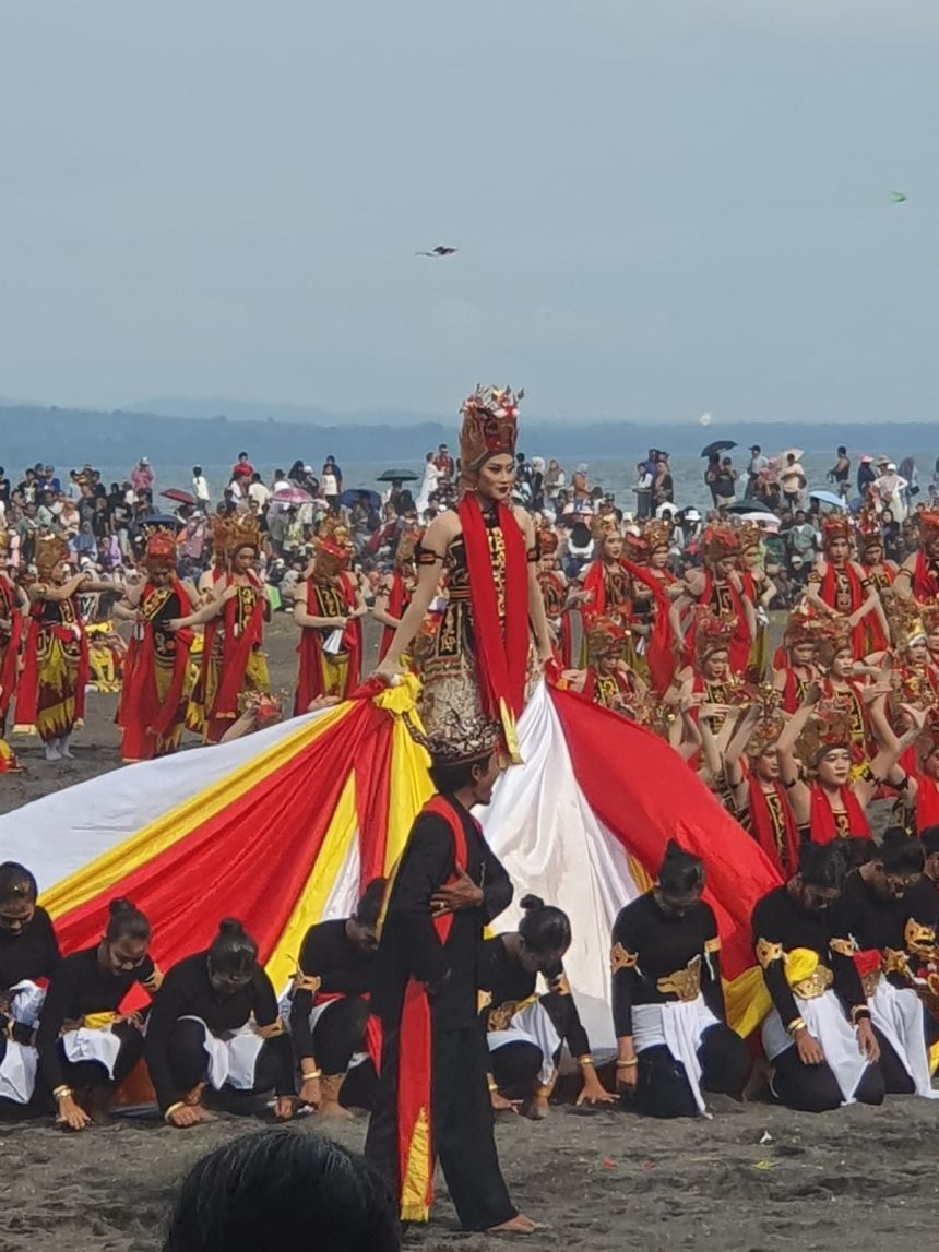 Terlihat, sorak kagum penonton menggema ketika penari utama berdiri megah di tengah formasi dengan balutan kain panjang merah, kuning, dan putih yang berkibar gagah. Adegan itu menjadi simbol kejayaan budaya Osing yang menjulang tinggi di tengah modernitas.